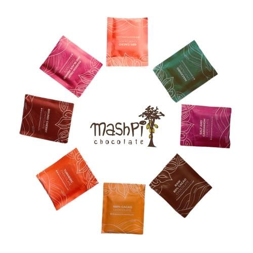 在来カカオのアリバ種を存分に味わえるカカオ65%、カカオニブ&70%、非加熱&低温発酵のローチョコレートのプレーン3種に加え、パッションフルーツと黒胡椒、塩とカルダモン、カラマンシー、マカンボ、ブルネイチェリーのフレーバー5種が5gのミニタブレットになってパッケージされています。もちろんマシュピ農園のアリバ・ナシオナル、乳化剤不使用のビーガンチョコレートです。カカオの研究をおいしく、たのしく! 冬のギフトにも毎年好評です。